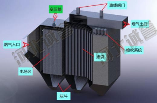 粉尘在电场中充分荷电除去粒径较大的粗尘,剩下荷电不充分但可在电场中被极化的粉尘进入滤袋除尘,滤袋对微细粉尘有很高的除尘效率。此法结合各种除尘机理,使不同粒径粉尘达到收集效果。