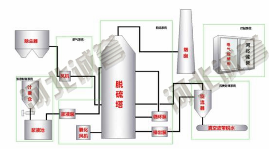石灰石-石膏法脱硫在电厂锅炉、供暖锅炉等工业锅炉窑炉烟气治理方面是应用较为广泛的一种脱硫工艺,该工艺采用石灰石作脱硫吸收剂,吸收剂与水混合搅拌制成石灰石浆液。在脱硫塔内,石灰石浆液与烟气接触混合,烟气中的SO2与浆液中的碳酸钙以及鼓入的氧化空气进行化学反应,SO2被脱除,反应产物为石膏。脱硫石膏浆经脱水装置脱水后回收。