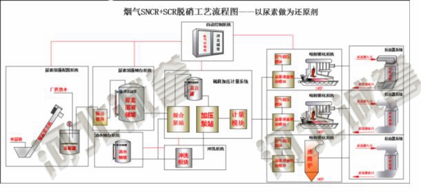 SNCR+SCR联合烟气脱硝技术不是选择性催化还原法工艺与选择性非催化还原法工艺的简单组合,它是结合了SCR技术高效、SNCR技术投资省的特点而发展起来的一种新型工艺。该工艺将SNCR工艺的还原剂喷入反应区技术与SCR工艺利用逃逸氨进行催化反应结合起来,进一步脱除NOX。联合脱硝工艺以氨或尿素作为吸收剂,是一种特殊的SNCR工艺与一种简洁的后端SCR脱硝反应器有效结合,充分发挥了SNCR工艺投资省、SCR工艺脱硝效率高的优势。